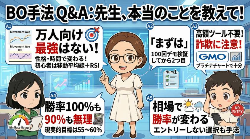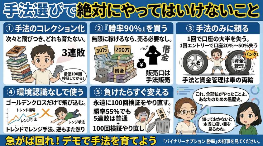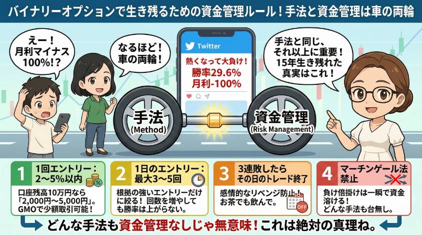 - 資金管理(1回2〜5%・1日3〜5回・3連敗撤退・マーチンゲール禁止)は手法と同等の重要性