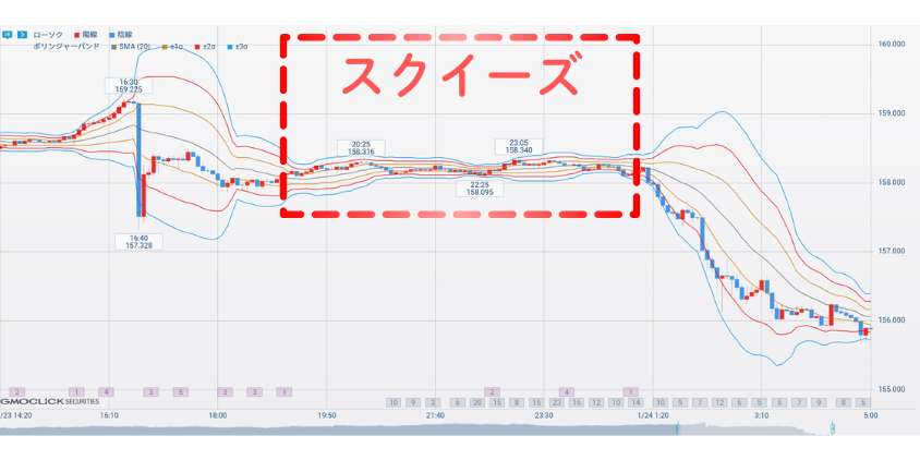 - ボリンジャーバンドが横ばいに収縮している(スクイーズ)