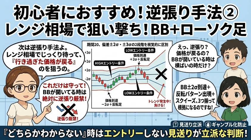 次は逆張り手法よ。レンジ相場でじっくり待って、「行き過ぎた価格が戻ってくる」タイミングを狙う手法。手法①のトレンドフォローとセットで覚えておけば、相場の状況に応じて使い分けられるようになるわ。