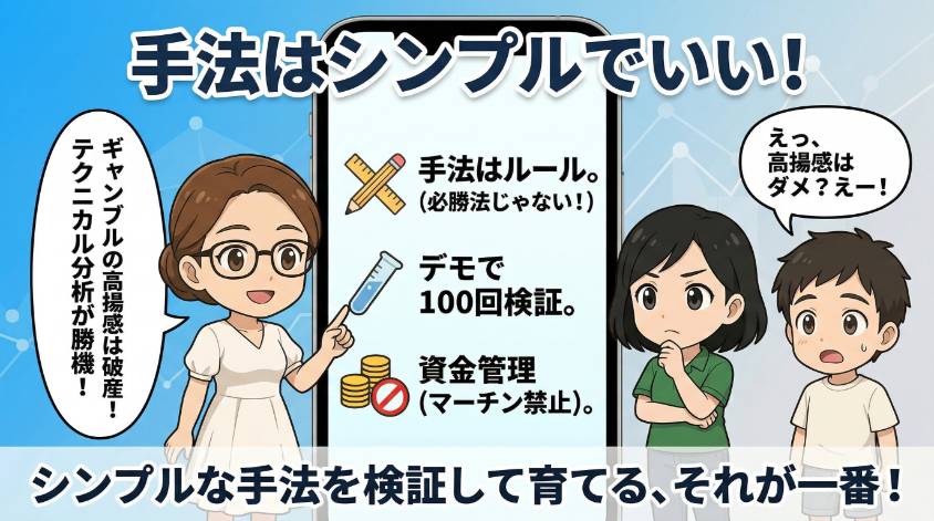 入る条件だけじゃないのよ。相場をどう読むか、資金をどう守るか全部込みで「手法」なの。