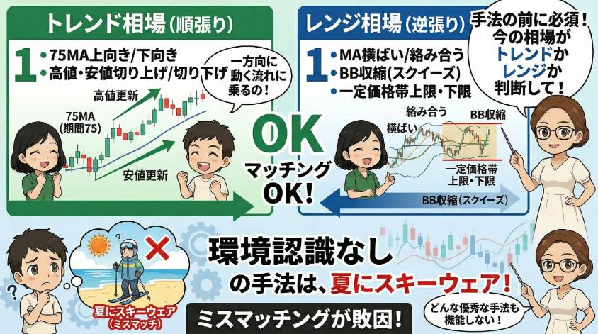 このマッチングを間違えると、どんな優秀な手法も機能しない。トレンド相場で逆張りすれば、流れに逆らうから当然負ける。レンジ相場で順張りすれば、すぐに反転してやられる。「手法が悪い」のではなく、「相場環境と手法がミスマッチしている」だけなのよ。