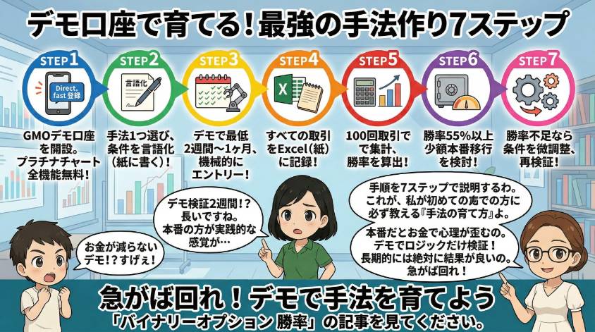 本当に約3分で取引画面が使えるようになって「こんなに早いのか」と驚いたわ。手法①を試すなら、まずここのデモ口座で練習することをお勧めするわ。