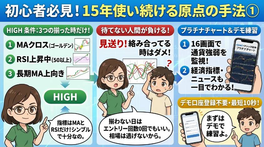 高額なサインツールは不要よ。GMOクリック証券のプラチナチャートに搭載されているテクニカル指標だけで、この記事で紹介した手法はすべて実践できる。SNSで販売されている高額ツール・サインツールの大半は詐欺。「ツールを使えば自動で稼げる」という言葉に騙されないで。相場を読む力は、自分自身の頭でつけるしかないの。