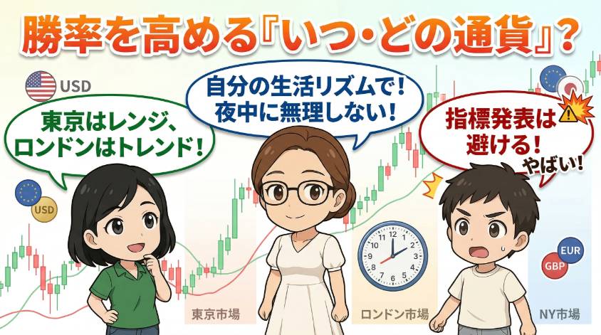 手法が揃っても、「いつ・どの通貨ペアで使うか」という時間帯と銘柄の選択で勝率が変わるのよ。同じ手法でも、相場が活発な時間帯と静かな時間帯では全く結果が違う。
