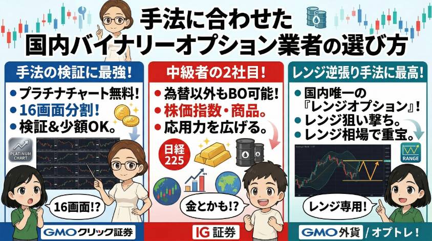 ⚠️ 免責事項:本記事は投資助言を目的としたものではありません。バイナリーオプションへの投資判断はご自身の責任のもとで行ってください。元本は保証されず、損失が発生する可能性があります。バイナリーオプションは金融商品取引法に基づく登録を受けた国内業者でのみ取引可能です。未登録の海外業者との取引には詐欺被害のリスクがあります。