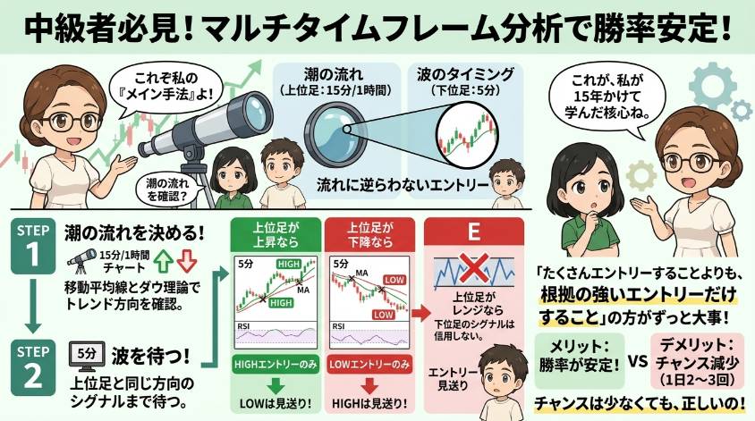 この手法を使い始めた頃のことを今でも覚えてる。「3つ条件が揃うまで入らない」というシンプルなルールが、最初は苦痛だったのよ。揃わない日もある。エントリー回数が0回の日もある。「こんなので本当に稼げるの?」って何度も思ったわ。