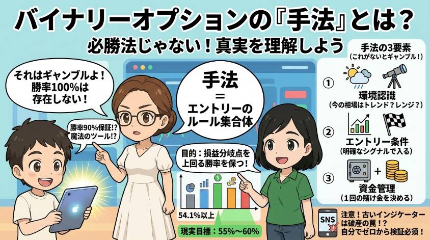 「手法を教えてください」これ、バイナリーオプション初心者の方から一番多くいただく質問よ。でもね、この質問に答える前に、まず「手法とは何か」という定義を正確に理解してほしいの。定義がズレたまま手法を探しても、一生迷子になるだけだから。