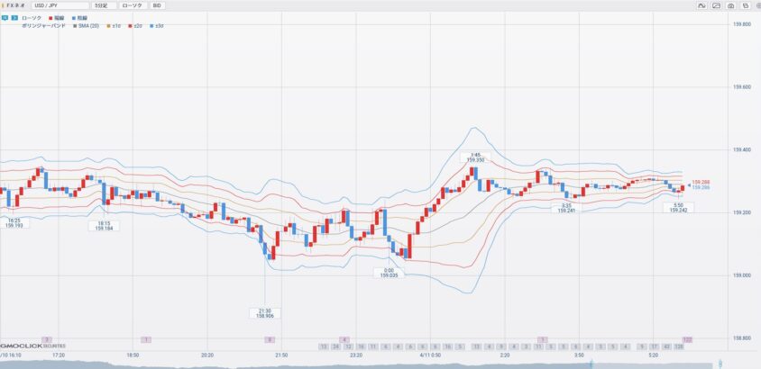 この時間帯のUSD/JPYは、ロンドンやNYと比べて値動きが穏やかで、レンジ相場になりやすい。手法②のボリンジャーバンド逆張りが機能しやすい環境なのよ。大きなニュースがなければ、±2σにタッチしてから反転するパターンがわかりやすく出てくれる。