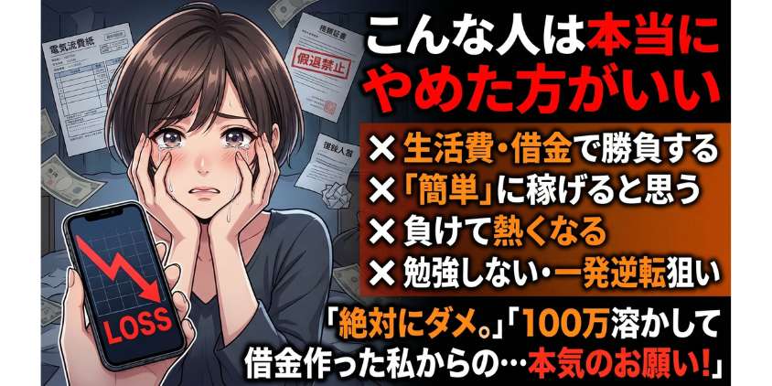 ひとつでも当てはまるなら、悪いことは言わない、今はやめておいた方がいい。これは煽りでも脅しでもなく、100万溶かして借金作った私からの本気のお願い。