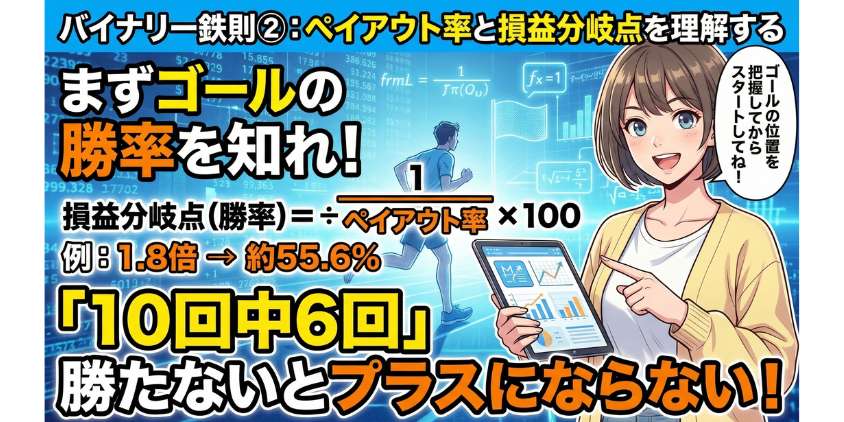 損益分岐点を計算すると、ペイアウト率1.8倍なら勝率55.6%以上をキープしないと赤字になる。50%じゃ確実にジリ貧。これが「やめとけ」と言われる大きな理由のひとつだね。