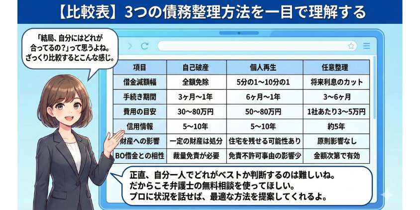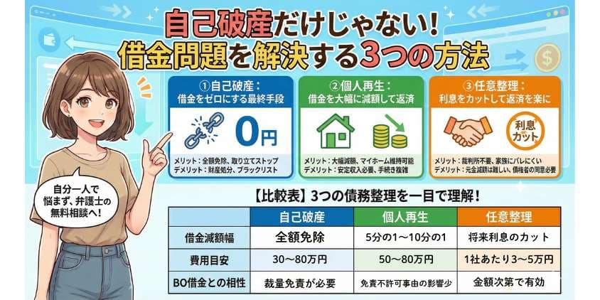 - 債務整理は自己破産・個人再生・任意整理の3つから状況に合ったものを選べる