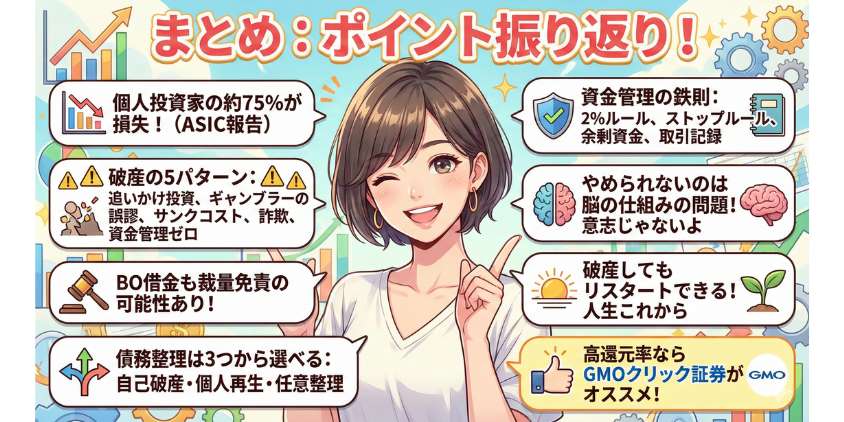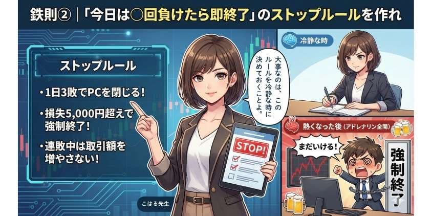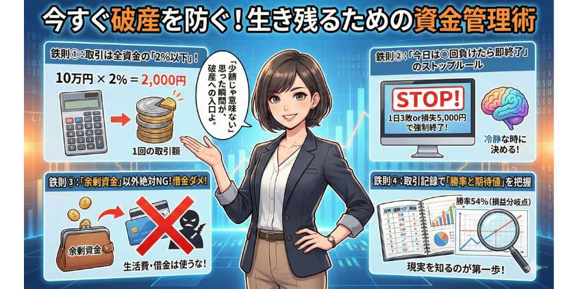- 資金管理の鉄則は「2%ルール」「ストップルール」「余剰資金のみ」「取引記録」