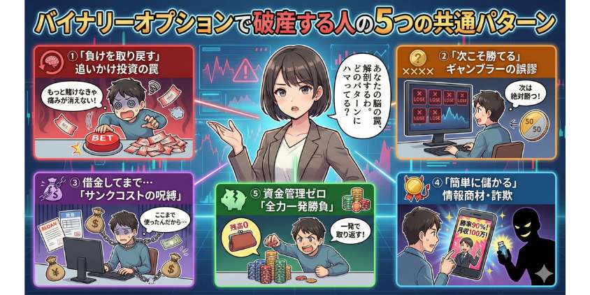 ここでは、なぜ人はバイナリーオプションで破産するまでやめられないのか、その心理的・行動的なメカニズムを解剖するわ。これを知ることで「自分が今どの罠にハマっているのか」が見えてくるはずよ。