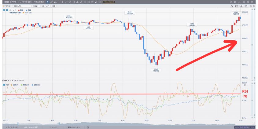 そこにRSIが70以上を示していれば「買われすぎ」の可能性も読み取れます。