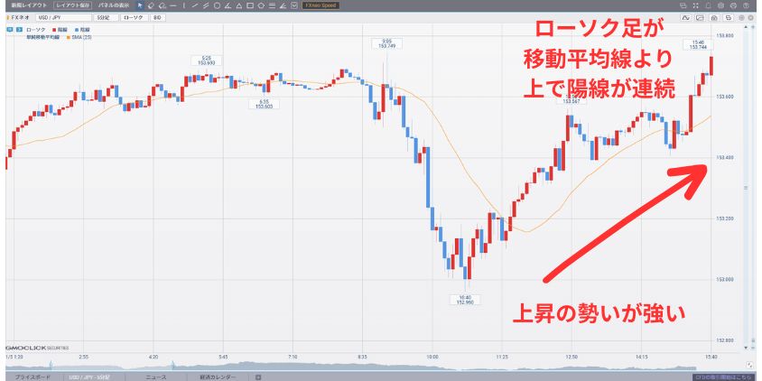 たとえば、ローソク足が移動平均線より上にあり、さらに陽線が連続していれば、上昇の勢いが強いと判断できます。