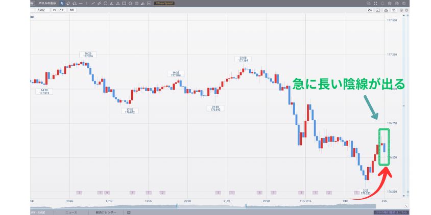 ローソク足に長いヒゲが出現したときは、反発のサインとして逆張りエントリーの好機です。たとえば、長い上ヒゲが出た場合は売り圧力が強いためLOWエントリー、長い下ヒゲが出た場合は買い支えがあるためHIGHエントリーが有効です。