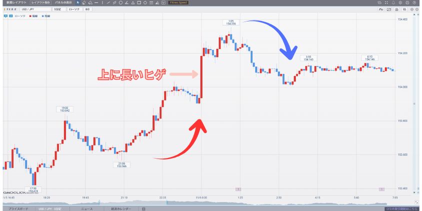 一方で、長い上ヒゲが出たあとは、逆張りでLOWエントリーを狙えることがあります。