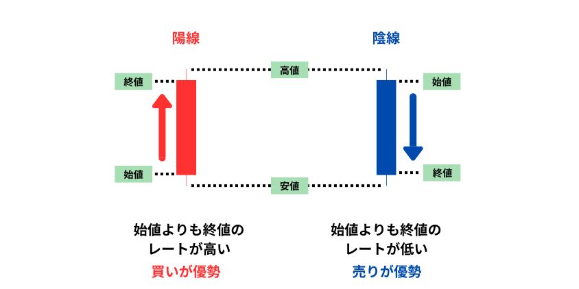 また、終値が始値より上なら陽線、下なら陰線と色で判断できるのもポイントです。