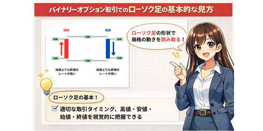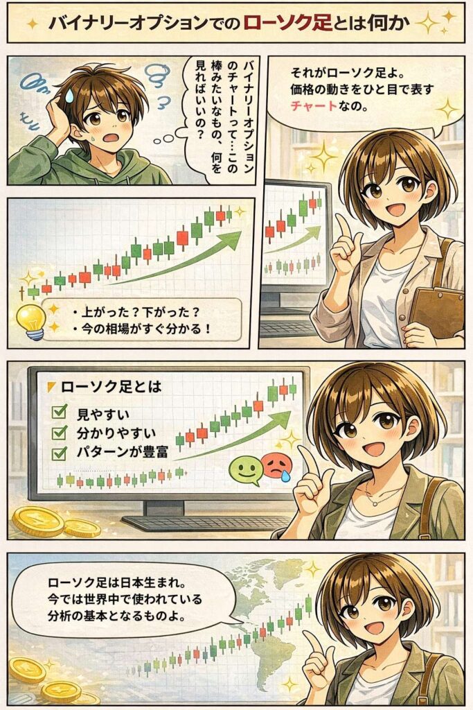 ローソク足は、始値・終値・高値・安値の4つの価格情報を1本で表すチャート形式です。相場の流れや投資家心理を視覚的に把握しやすいため、バイナリーオプションをはじめとするあらゆる取引において重要な分析ツールです。