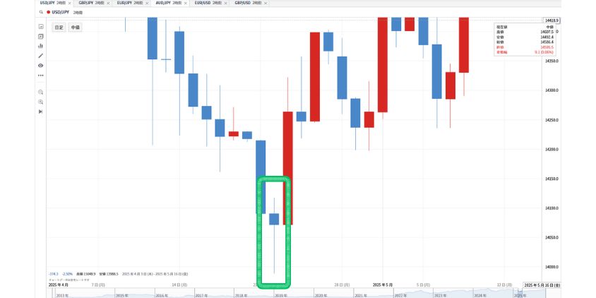 でも、その陰線がたまたまの動きだった場合、早まって逆張りすると負けてしまいます。
