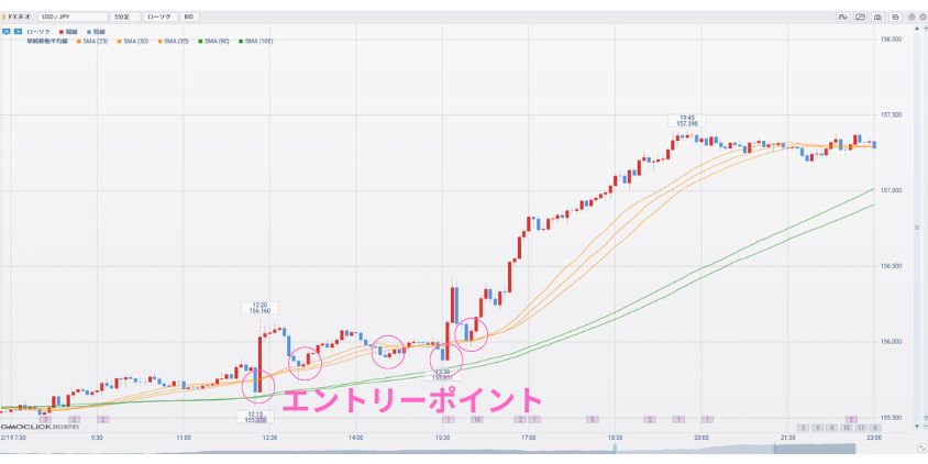 15分足で上昇トレンド中に、5分足で小さな押し目が出た場合、そこがエントリーポイントになります。