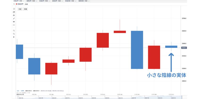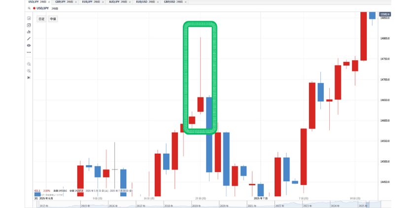 これは「上では売りが強い」というサインになり、次の値動きを予想する材料になります。