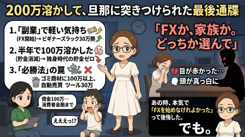 私は200万溶かした。借金100万を作った。旦那に最後通牒を突きつけられた。何度も「FXを始めなければよかった」と後悔した。夜中に布団の中で泣いたこともある。