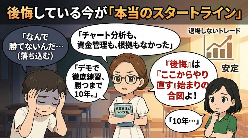 でもね、あの後悔があったから、今の私がいる。正しいやり方を学び直して、10年かけて、ようやく「退場しないトレード」ができるようになった。