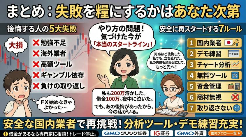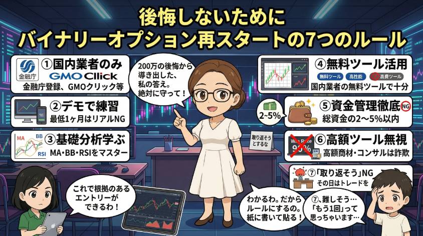- 再スタートの7ルール:国内業者・デモ練習・チャート分析・無料ツール・資金管理・商材無視・取り返さない