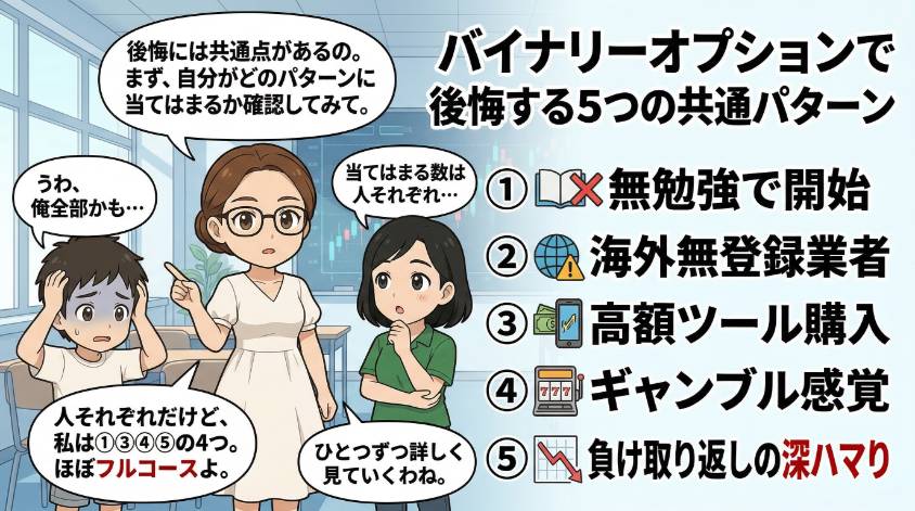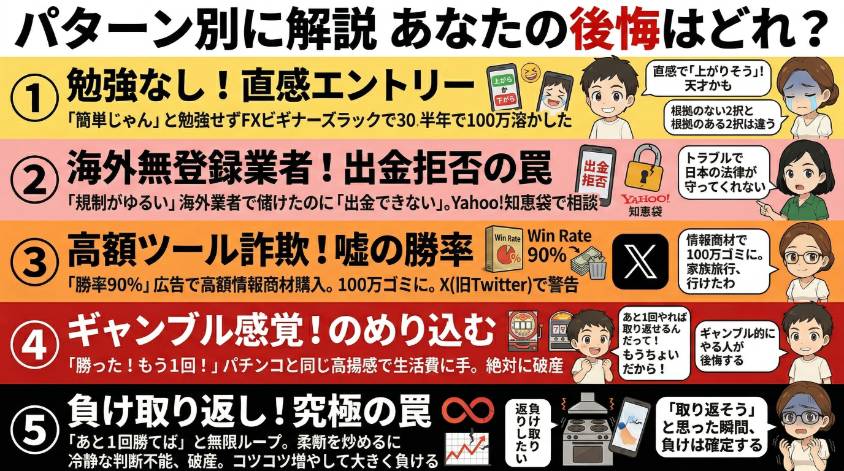 - 後悔する人の共通パターンは5つ:勉強不足・海外業者・高額ツール・ギャンブル依存・負けの取り返し