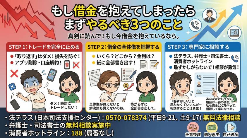 - 借金を抱えているなら、まずトレードを止めて専門家に相談すること