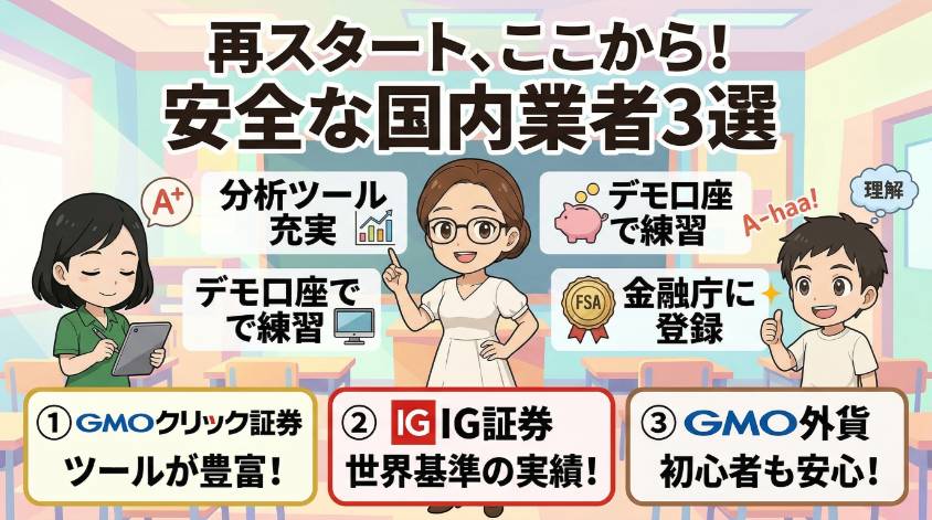 再スタートするなら、分析ツールが充実していて、デモ口座で練習もできて、金融庁に登録されている安心な業者から始めてね。