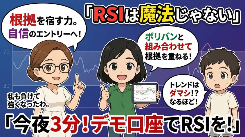 RSIは万能の魔法じゃない。でもね、正しい理解の上で使えば、あなたのエントリーに初めて「根拠」が生まれるの。「なんとなくHIGHかな…」っていう不安なエントリーと、「RSIが反転サインを出して、ボリンジャーバンドもバンドウォークが止まりかけてる。よし、根拠が2つ揃ったっていうエントリー。どっちが自信を持てるか、もう言わなくてもわかるわよね?