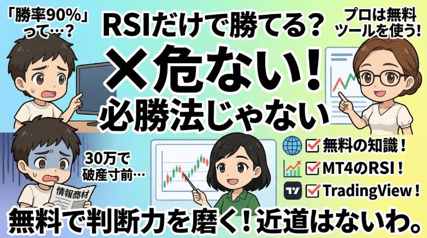 ネットを検索すると「RSIで勝率90%の手法!」「RSI設定を変えるだけで月収100万!」みたいな情報がゴロゴロ出てくるわよね。はっきり言って、そんなものは存在しない。もし存在するなら、その人はわざわざ他人に教えずに自分だけで使ってるはずでしょう?