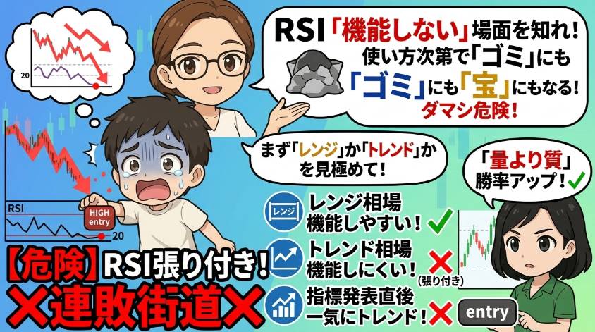 ここが一番大事なところよ。正直に言って、RSIには「効く場面」「効かない場面」がある。これを知らずに使うと、私みたいに連敗街道をまっしぐらに進むことになるわ。