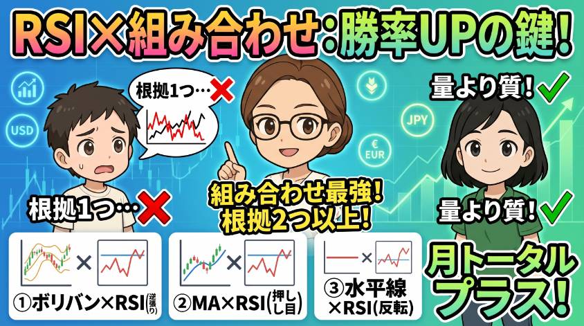 RSIは単体で使うものじゃない。他のインジケーターと組み合わせて初めて本領を発揮するの。これは断言するわ。
