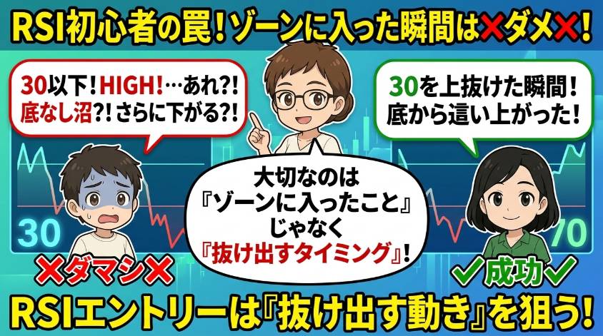 ここがRSI初心者の最大のつまずきポイントよ。さっきりょうが言ったみたいに、「30以下になったらHIGH!」「70以上になったらLOW!」って反射的にエントリーする人がすごく多い。でもね、大切なのは「ゾーンに入ったこと」じゃなくて、「ゾーンから抜け出すタイミング」なの。