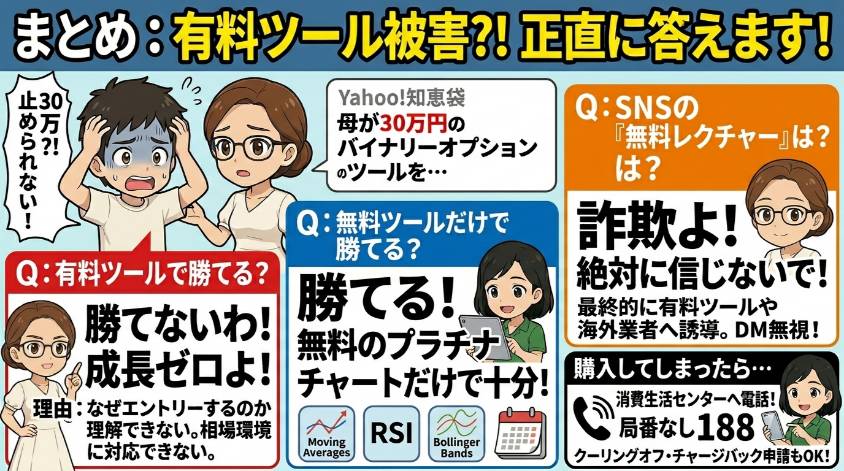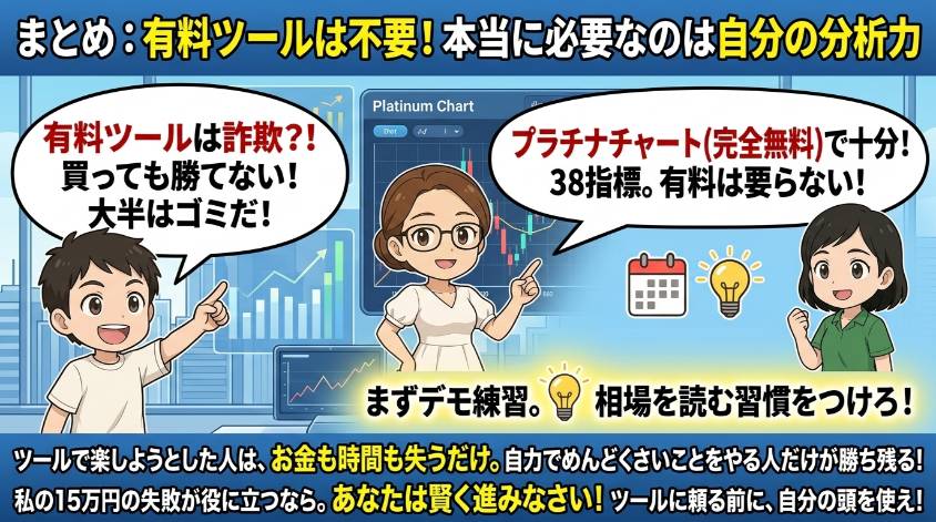 “有料ツール”って一口に言っても中身はピンキリ。でも全部に共通しているのは「自分で考えなくていい」と思わせる売り方をしていること。これが一番危険なの。自分の頭を使わなくていいと思った瞬間、あなたのトレードスキルは成長がゼロになる。それを覚えておいてほしいわ。