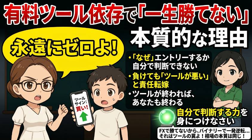有料ツールが詐欺まがいである以上に深刻な問題がある。たとえそのツールが「たまたま当たる」ものだったとしても、ツールに依存し続ける限り、あなたのトレードスキルは永遠にゼロのまま。これが本質的な問題よ。