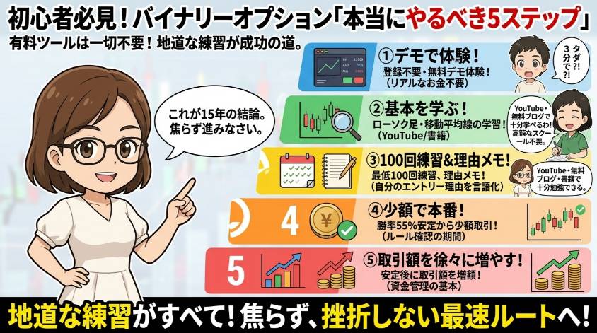 このステップ、どこにも「有料ツールを買う」という工程がないでしょ? それが答えよ。バイナリーオプションで勝つために必要なのは高額ツールじゃなくて、地道な練習と勉強。つまらない答えかもしれないけど、15年やってきた私の結論はそれしかないわ。