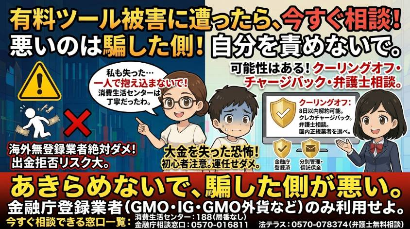私も15万円のツールを買った後、消費生活センターに電話したわ。最初は「こんなことで電話していいのかな……」と少し躊躇したけど、担当者はとても丁寧に対応してくれた。一人で抱え込むことなく、すぐに相談してほしい。「自分が悪い」と思い込まないで。あなたを騙した側が悪いのよ。