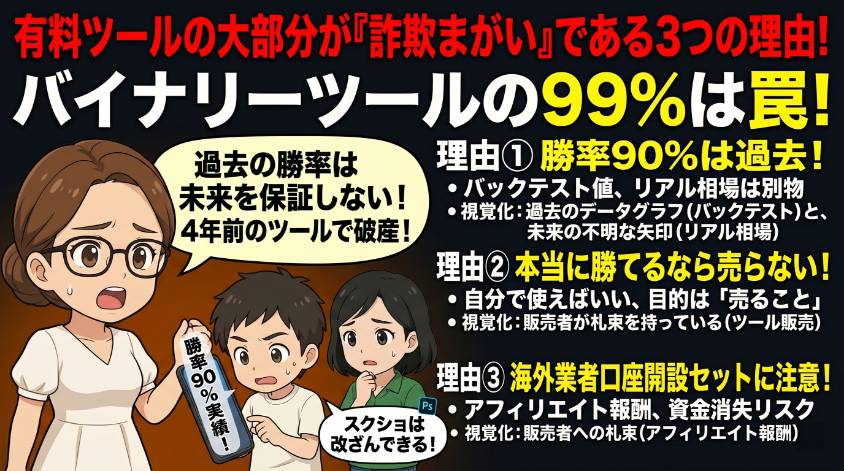 もし本当に「勝率90%」「月収100万円」を叩き出せるツールがあるとしたら、販売者はなぜそれを他人に売るの? 自分で使い続ければ、理論上は無制限に稼ぎ続けられるはず。わざわざ他人に売る理由は一つしかない。「ツールを売った方が確実に儲かるから」よ。