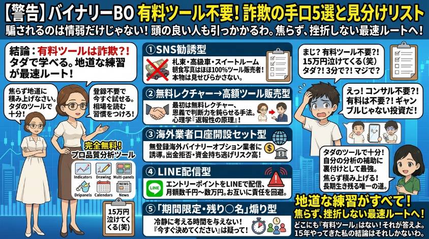 この記事を読み終えれば、バイナリーオプション有料ツールの実態・詐欺の見分け方・本当に使うべき無料ツール・そして被害に遭ってしまった時の対処法まで、すべてがわかる。15年トレードしてきた私が知ってる全部を書いたわ。