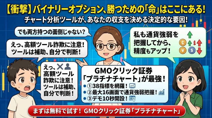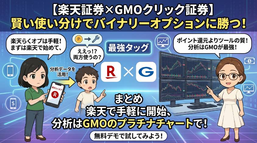 結論から言うと両方持つのがおすすめ。楽天証券の口座をすでに持っているなら、らくオプで手軽に体験できる。ただし本格的にチャート分析をしながら勝率を上げたいなら、GMOクリック証券のプラチナチャート(38種テクニカル指標、16画面分割)が圧倒的に高機能。口座開設は無料なので、両方持って使い分けるのが賢い選択。