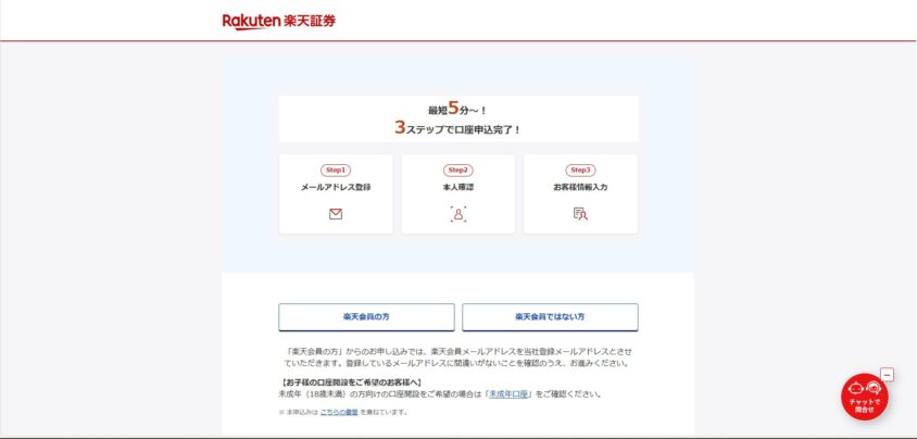 すでに楽天証券の口座を持っていればスキップ。持っていない場合は、楽天証券の公式サイトから総合口座を開設するところからスタート。本人確認書類とマイナンバーが必要。最短で翌営業日に開設完了するわよ。
