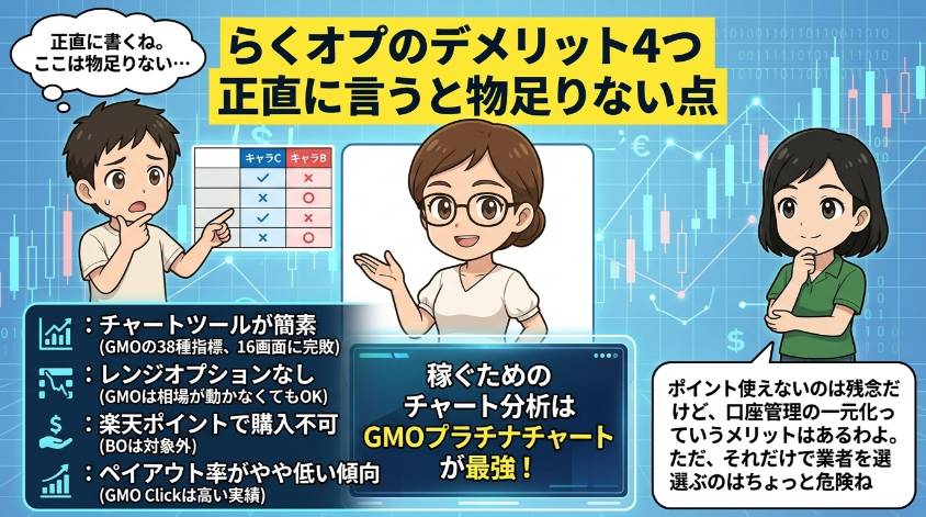 でもね、トレードで大事なのは「ポイント還元」じゃなくて「分析ツールの質」。ここを間違えると私みたいに遠回りするわよ。楽天で手軽に始めて、分析はGMOクリック証券のプラチナチャートで。この組み合わせが、今の私のベストアンサー。