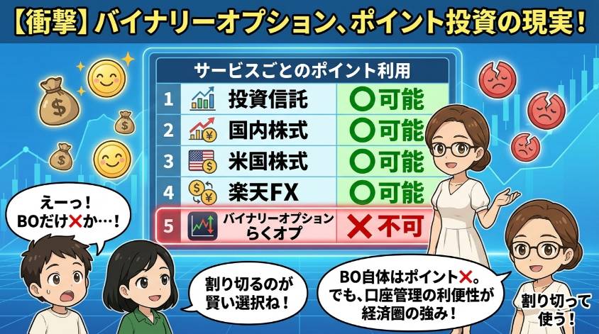「楽天 バイナリーオプション」で検索する人の多くが気になってるのがこれだと思う。楽天ポイントと投資サービスの関係を整理するね。