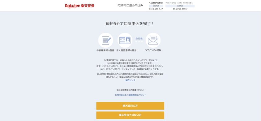楽天証券の口座自体を持っていない場合は、まず総合口座→FX口座の順に開設する必要があるけど、それでも他社でゼロから始めるよりは楽天ユーザーにとってはスムーズよ。