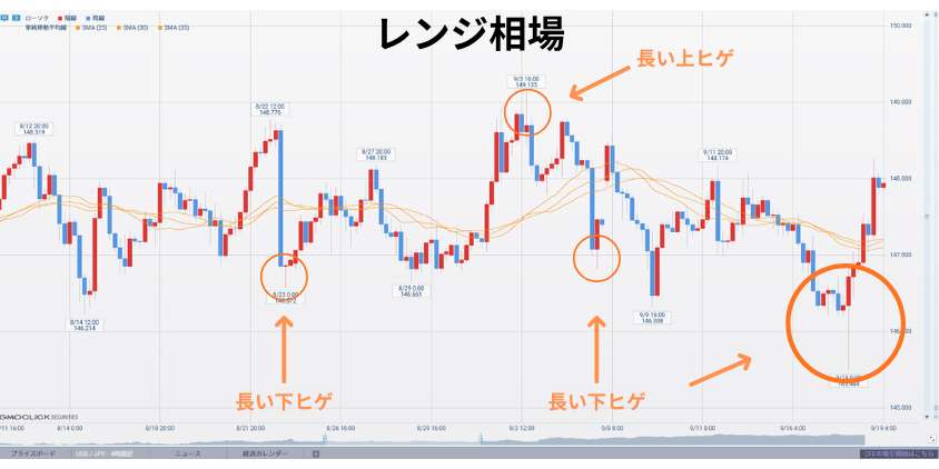 移動平均線が横向きで、移動平均線の上下を価格が行ったり来たりするとレンジ相場になる傾向があります。