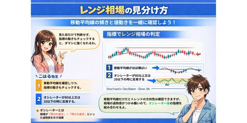 レンジ相場の判定は、移動平均線で方向を見て、オシレーターで行きすぎ確認するのが分かりやすいです。